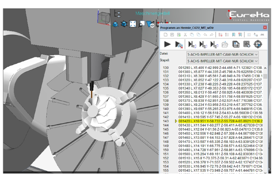 Für Kunden, die überprüfen und verifizieren möchten, wie NC-Programme tatsächlich auf einer Fräsmaschine und Steuerung funktionieren, kontrolliert und simuliert die virtuelle Maschinen Simulationssoftware Eureka von Roboris diese anhand eines identischen, digitalen Zwillings der Maschine und Steuerung des Kunden. Dies ermöglicht eine 100-prozentige Reproduktion der Endbearbeitung, wodurch Bearbeitungstests entfallen und das Risiko von Schäden während der Bearbeitung vermieden wird.